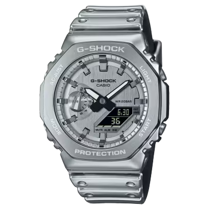 G-STEEL destaca por su sofisticado brillo en una combinación monocromática de tonos plateados. La estética monocromática combina un bisel metálico plateado con una resistente correa de silicona a juego. La superficie de la correa está protegida con una lámina de uretano tratada con deposición de vapor en plata, logrando un brillo metálico en una correa extremadamente suave y cómoda. Suaves y versátiles de llevar, estos relojes con su brillante acabado metálico son piezas de moda ideales para cualquier ocasión. Elige tu favorito: el icónico GM-2100 con su bisel octogonal.