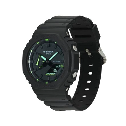 Puedes lucir una pequeña explosión de color sobre negro mate con un diseño especial que destaca gracias a las notas de neón. La forma octogonal y el diseño estilizado del GA-2100 aúnan el negro mate texturizado y vibrantes colores de neón para crear una estética innovadora, elegante y moderna. Las manecillas de las horas y los minutos con pintura fosforescente son visibles en la oscuridad, para que sepas la hora en cualquier momento del día o la noche.