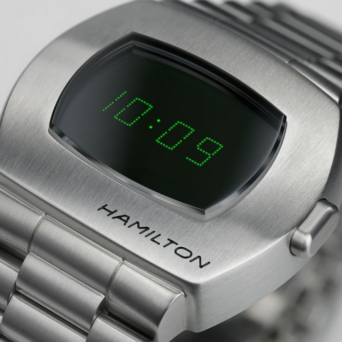 El icónico Hamilton PSR Digital Quartz supone una continuación de la historia de innovación que inauguró el primer reloj eléctrico del mundo en 1970. Con una pantalla digital híbrida que combina las tecnologías LCD y OLED, sus números verdes son fáciles de leer a simple vista durante el día y cuenta con un pulsador para mejorar la legibilidad durante la noche.