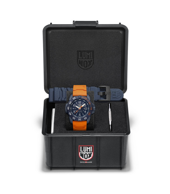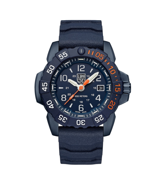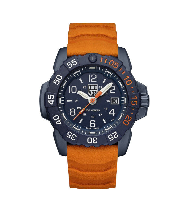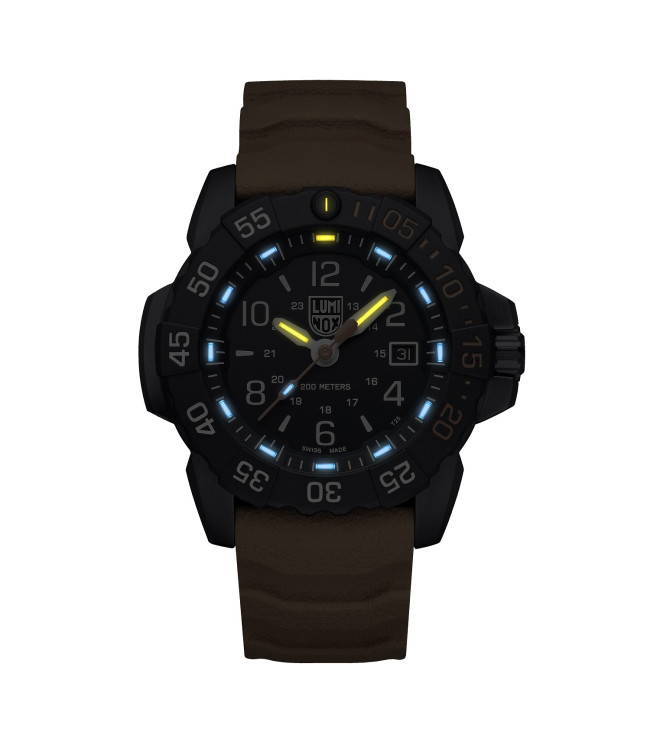 Reloj con caja de acero inoxidable PVD y bisel giratorio, cristal de zafiro con revestimiento antirreflectante y corona roscada. Siempre visible.