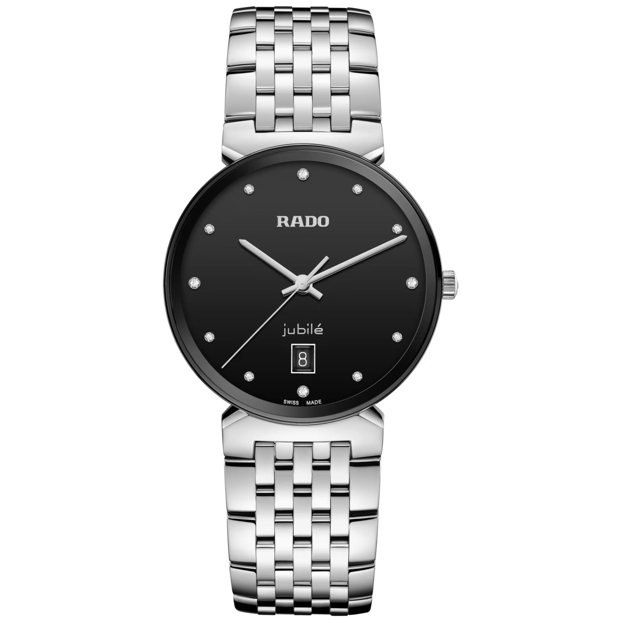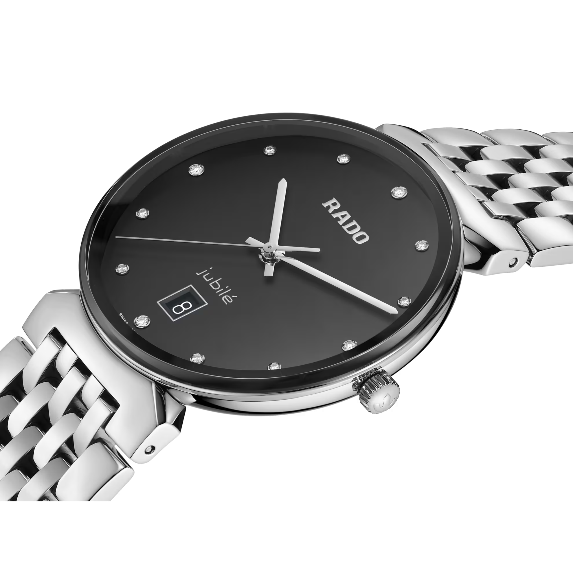 El armonioso diseño del Rado Florence Classic evoca las elegantes cúpulas y torres de la ciudad de la que la colección toma prestado su nombre. El reloj de 38 mm incluye un cristal de zafiro curvado y biselado de una sola pieza. La caja, el bisel, la corona y el brazalete están elaborados en acero inoxidable pulido. La esfera de color negro con un patrón de rayos de sol y 12 diamantes, realzada con el logotipo “Jubilé”, hace juego a la perfección con las agujas rodiadas. El mecanismo de cuarzo calibre R073 de tres agujas aporta al reloj mayor exactitud y resistencia a los golpes. El reloj ofrece resistencia al agua hasta 50 m y también está disponible en talla S, lo que lo convierte en un reloj perfecto para parejas.