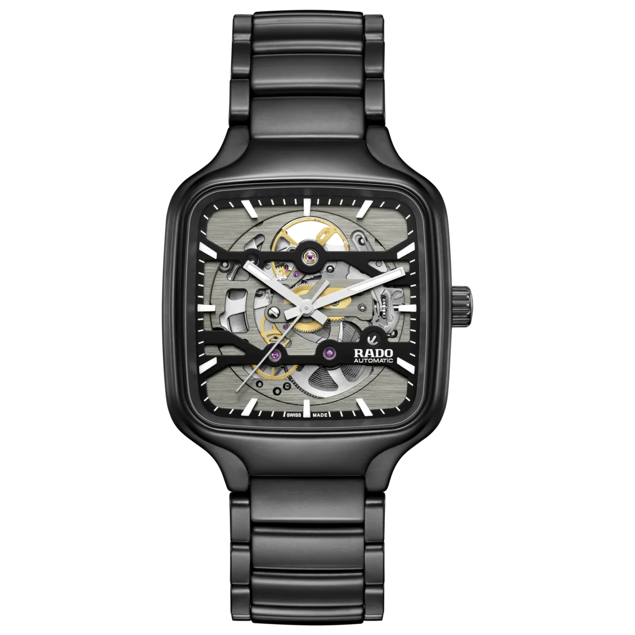 El Rado True Square Skeleton combina complejos materiales de alta tecnología con una labor artesanal exquisita. El movimiento esqueletizado R808, alojado en una caja de cerámica de alta tecnología de color negro mate de 38 mm con diseño monobloque, incorpora 25 piedras preciosas y ofrece 80 horas de reserva de marcha. Sometido a rigurosos ensayos en cinco posiciones, cuenta con una espiral de Nivachron™ antimagnética y está decorado mediante cepillado horizontal en la cara de la esfera, lo que convierte a este movimiento en una verdadera demostración de la tradición suiza en el campo de la ingeniería de alta precisión. La esfera, coronada por un cristal de zafiro plano, es una sinfonía de artesanía en varios niveles. La placa superior esqueletizada, de color negro y pulida con chorro de arena, flota sobre la placa inferior. En la placa superior están colocados con precisión los índices de Super-LumiNova® y las marcas de minutos, ambos de color blanco, que proporcionan una legibilidad perfecta sobre el fondo oscuro. Justo debajo, la placa inferior deja a la vista el refinado cepillado horizontal con el que está decorada, en perfecta armonía con el movimiento. El icónico emblema rodiado de ancla móvil, situado a las 4 en punto, completa esta auténtica exhibición de dinamismo y multidimensionalidad. La caja va acompañada de un brazalete de cerámica de alta tecnología de color negro mate, que acaba de forma impecable en un cierre desplegable de titanio y proporciona a la persona que luzca el reloj la excepcional comodidad que caracteriza a este material.