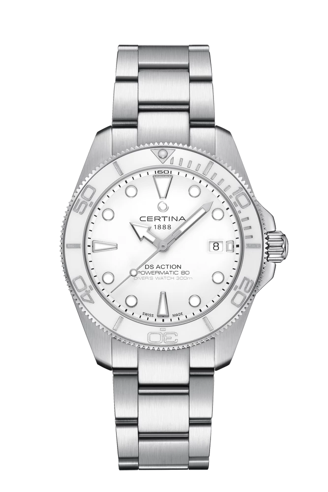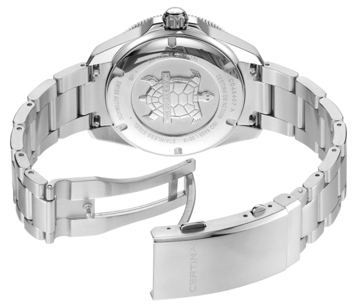Con su hermeticidad hasta 300 m y su certificación ISO 6425:2018, este modelo cumple los más altos estándares de los relojes de submarinismo profesionales. El DS Action Diver 40,5 mm también marca el hito de ser el primer reloj Certina que incluye una innovación en el sistema DS: el «New DS Concept Extreme Shock Resistance».