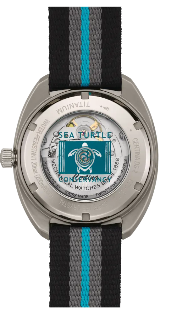 En los años 60, los precursores del DS-2 Turning Bezel establecieron el estándar para una construcción sólida y un estilo moderno. La nueva colección es igual en todos los aspectos. La caja en forma de tonel (42 × 41 mm) cuenta con un bisel giratorio unidireccional. Mientras que los modelos habituales están hechos en el clásico acero inoxidable, el Sea Turtle Conservancy Edition es de titanio ultraligero. La esfera negra mate con sus agujas rectangulares e índices revestidos de Super-LumiNova® combinan a la perfección. Esta edición especial se lleva con una correa de #tide ocean material® a rayas grises y azules y está provista de un cierre de titanio. Los modelos de acero inoxidable se comercializan con dos correas intercambiables.