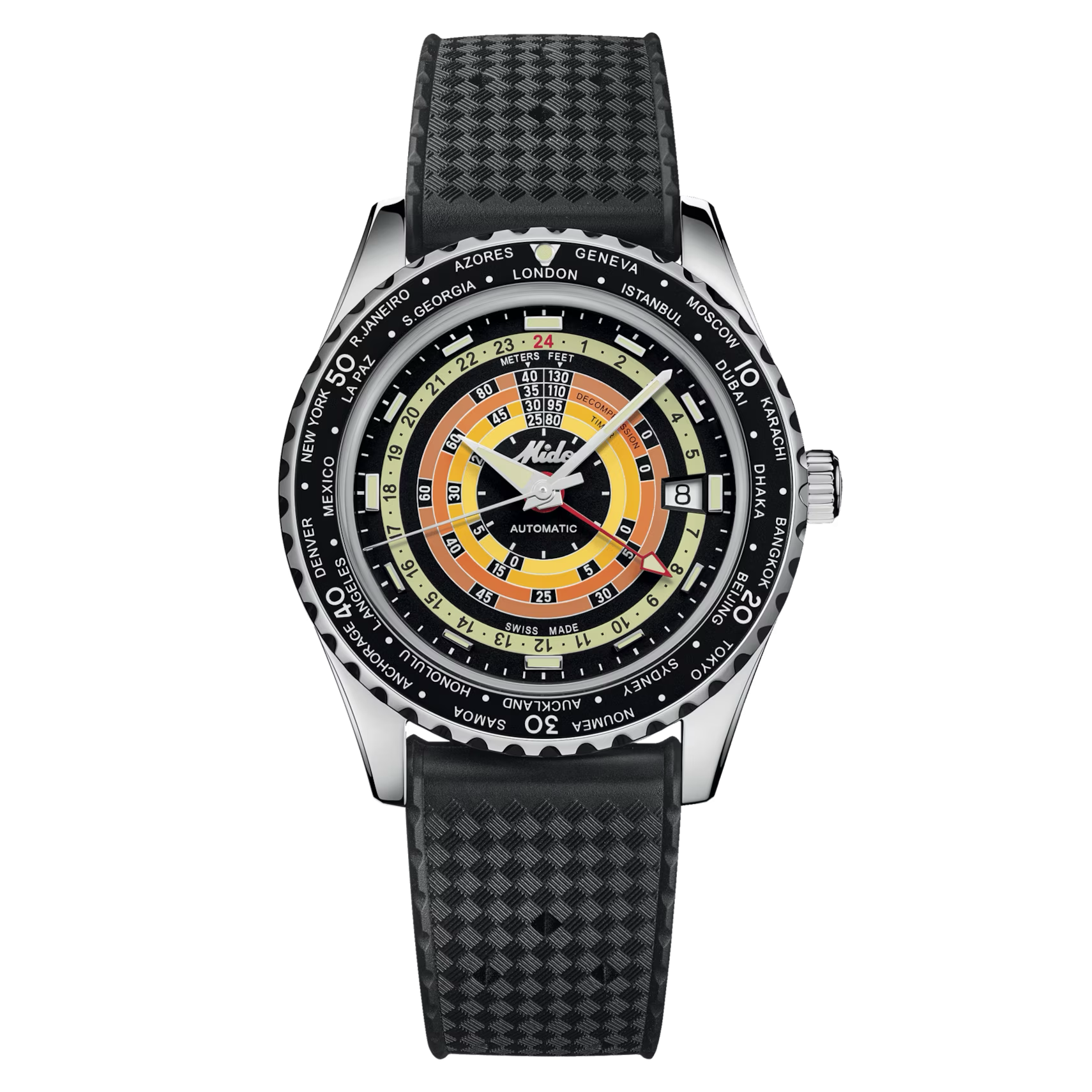 Irresistible estilo neo-vintage, colores brillantes y tecnología de punta: el nuevo Ocean Star Decompression Worldtimer conserva este encanto vintage, y la adición de una pantalla de zona horaria adicional lo impulsa hacia nuevos horizontes. Mido ha utilizado las últimas tecnologías en su búsqueda continua de la excelencia: Super-LumiNova®, un cristal de zafiro estilo caja de vidrio, el formidable Calibre 80 con espiral Nivachron™ y función GMT, así como una correa adicional fácil de cambiar. Una estrella de mar está grabada en el fondo de caja atornillado de este nuevo modelo, que es resistente al agua hasta una presión de 20 bar (200 m/660 pies).