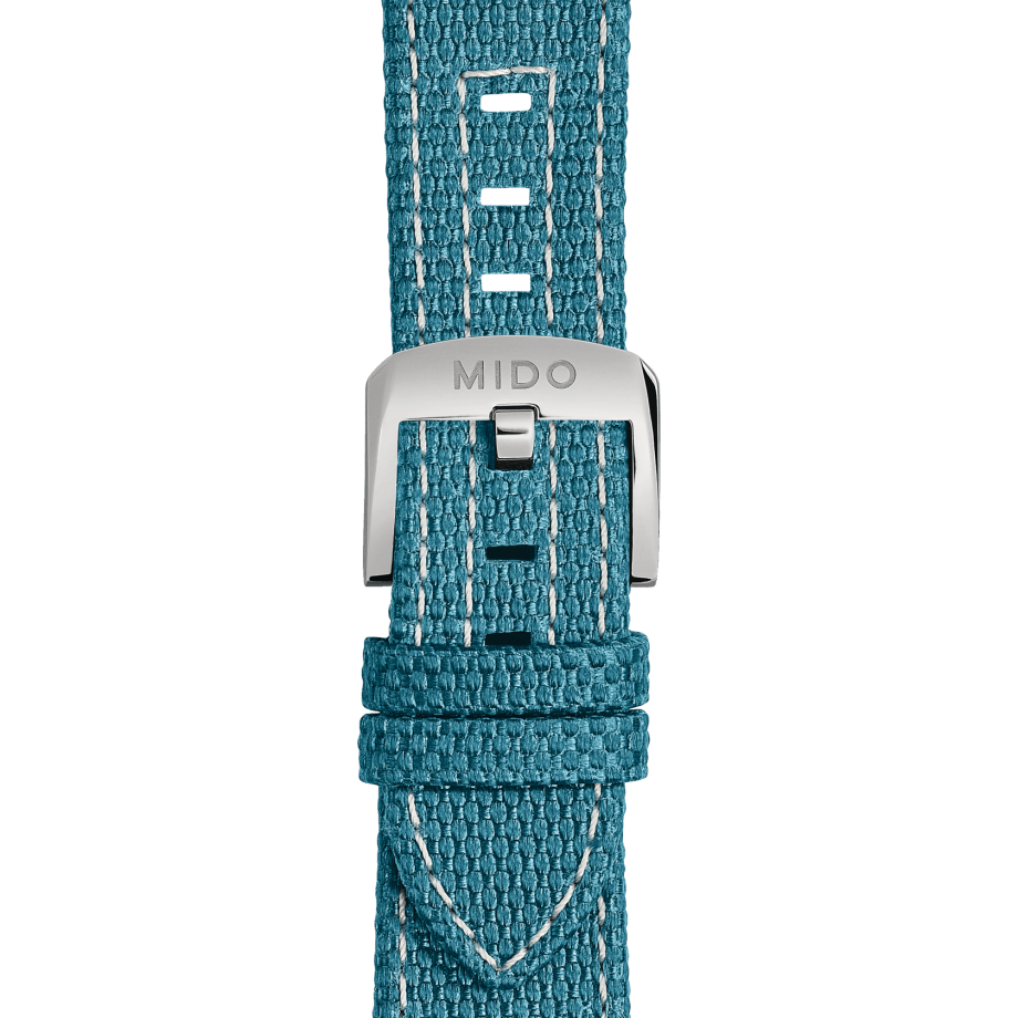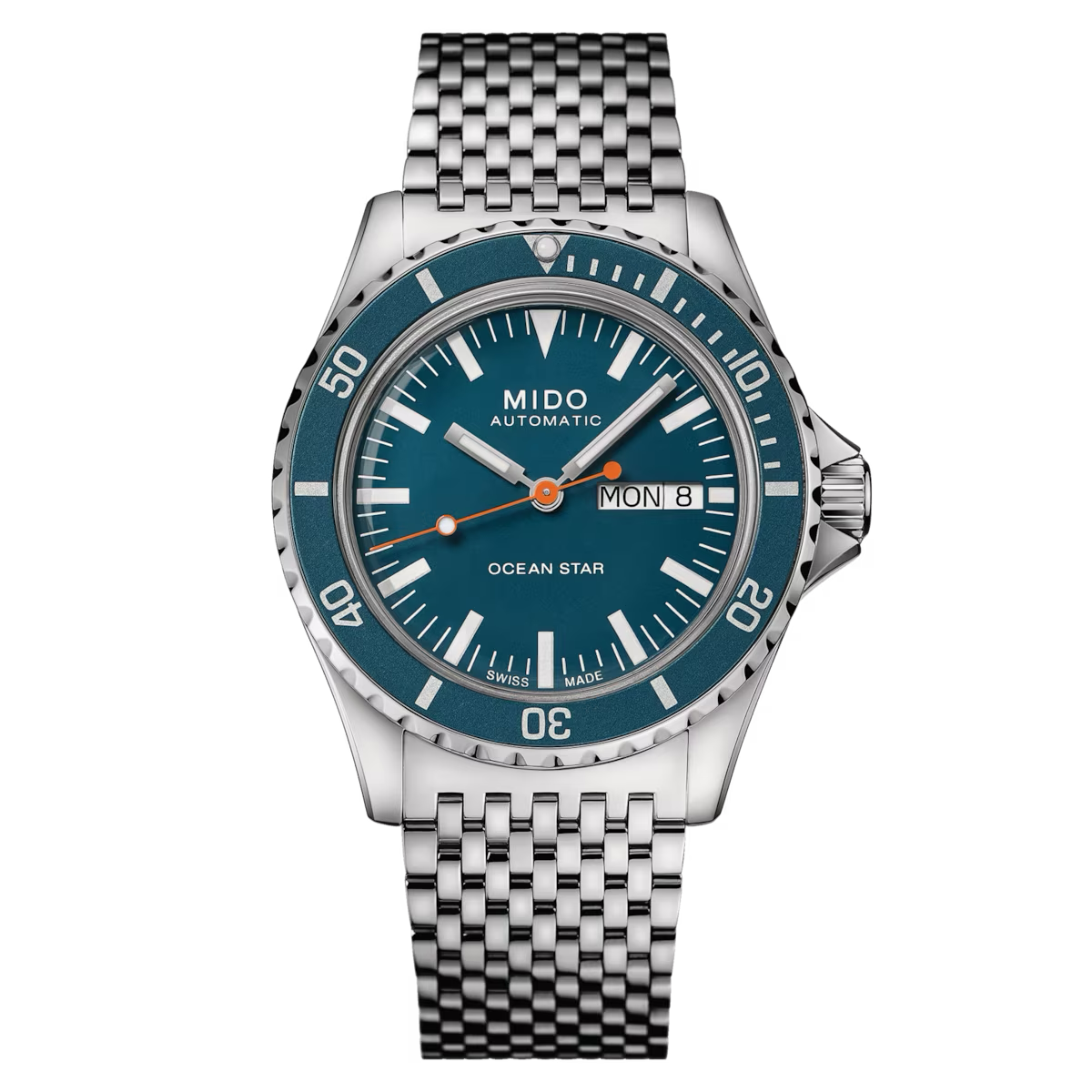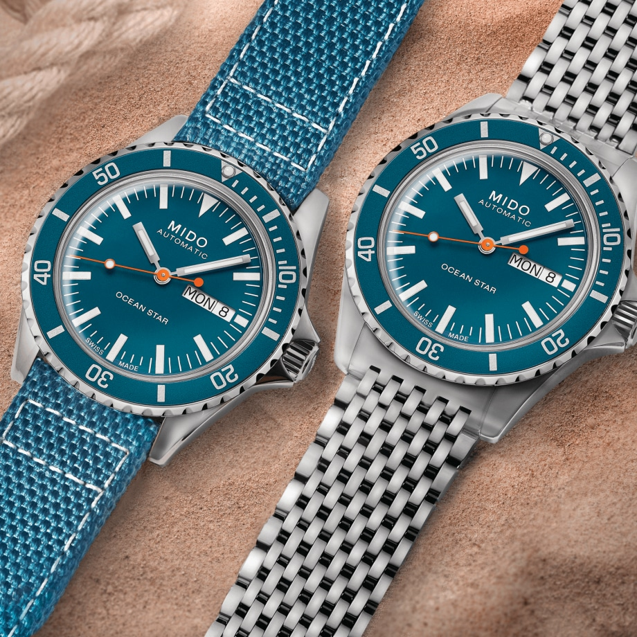 Mido rinde homenaje a la colección Ocean Star. En una sutil referencia al pasado, el reloj Ocean Star Tribute Swiss reinterpreta los códigos estéticos de los modelos de buceo de los años 60. Está equipado con el movimiento automático Calibre 80 con hasta 80 horas de reserva de marcha, es resistente al agua hasta una presión de 20 bar (200 m/656 pies) y presenta una correa única que ofrece la máxima comodidad.