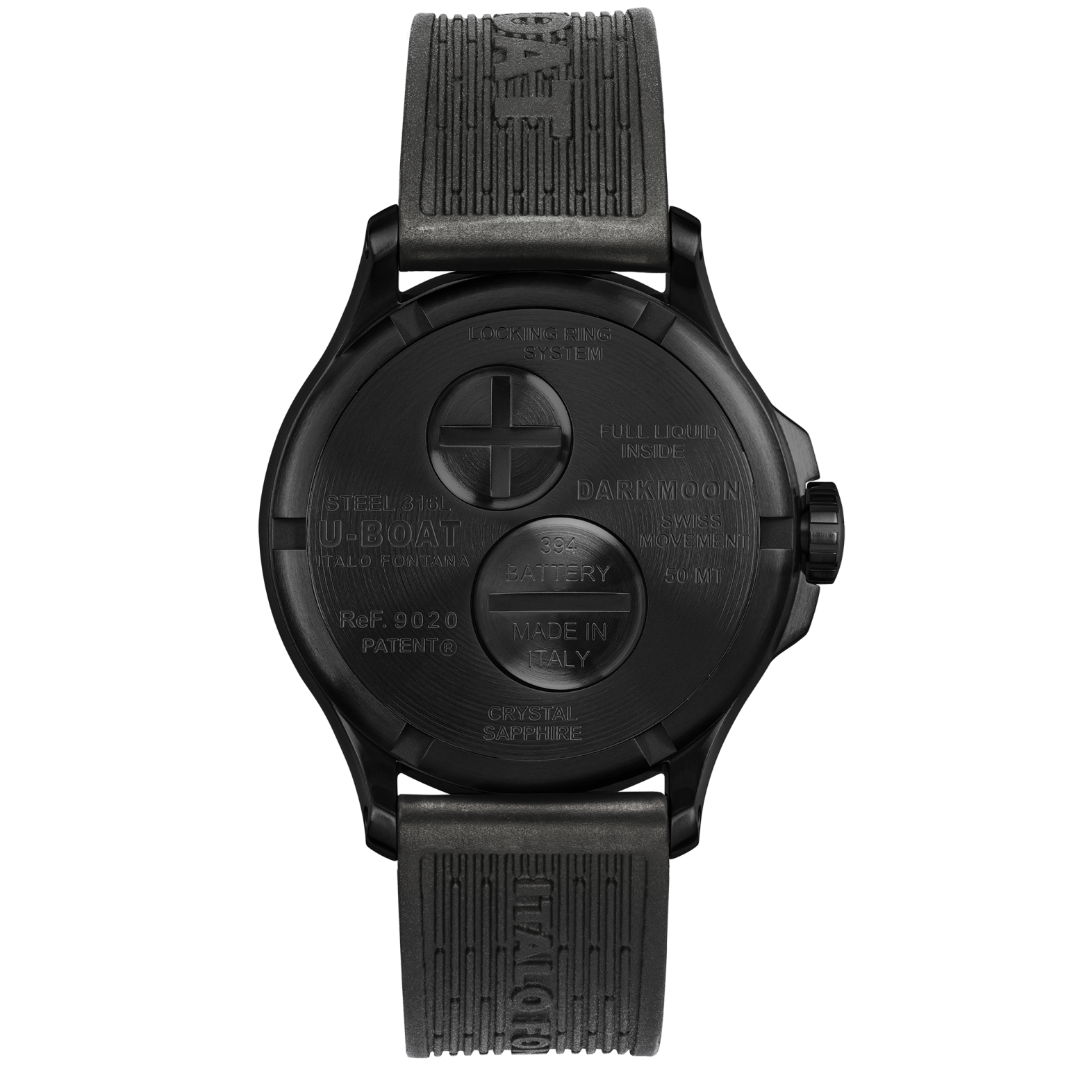 Una colección inspirada en el lado oscuro de la luna. La caja de PVD está completamente rellena con un aceite especial que realza la esfera, creando un efecto óptico de un negro más intenso y una mayor legibilidad. Innovador sistema de bloqueo (Locking ring system) con cambio rápido de batería.