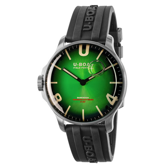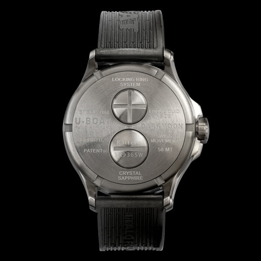 Una colección inspirada en el lado oscuro de la luna. La caja está completamente rellena con un aceite especial que enfatiza la esfera, realizada en metal verde con acabado soleil, creando un efecto óptico de color más intenso y mayor legibilidad. Sistema de bloqueo innovador (sistema de anillo de bloqueo) con reemplazo rápido de la batería.